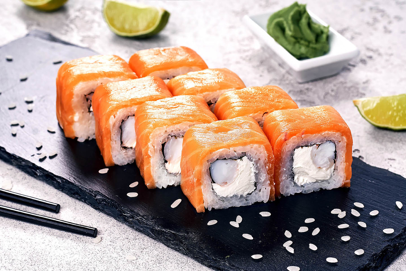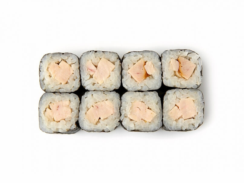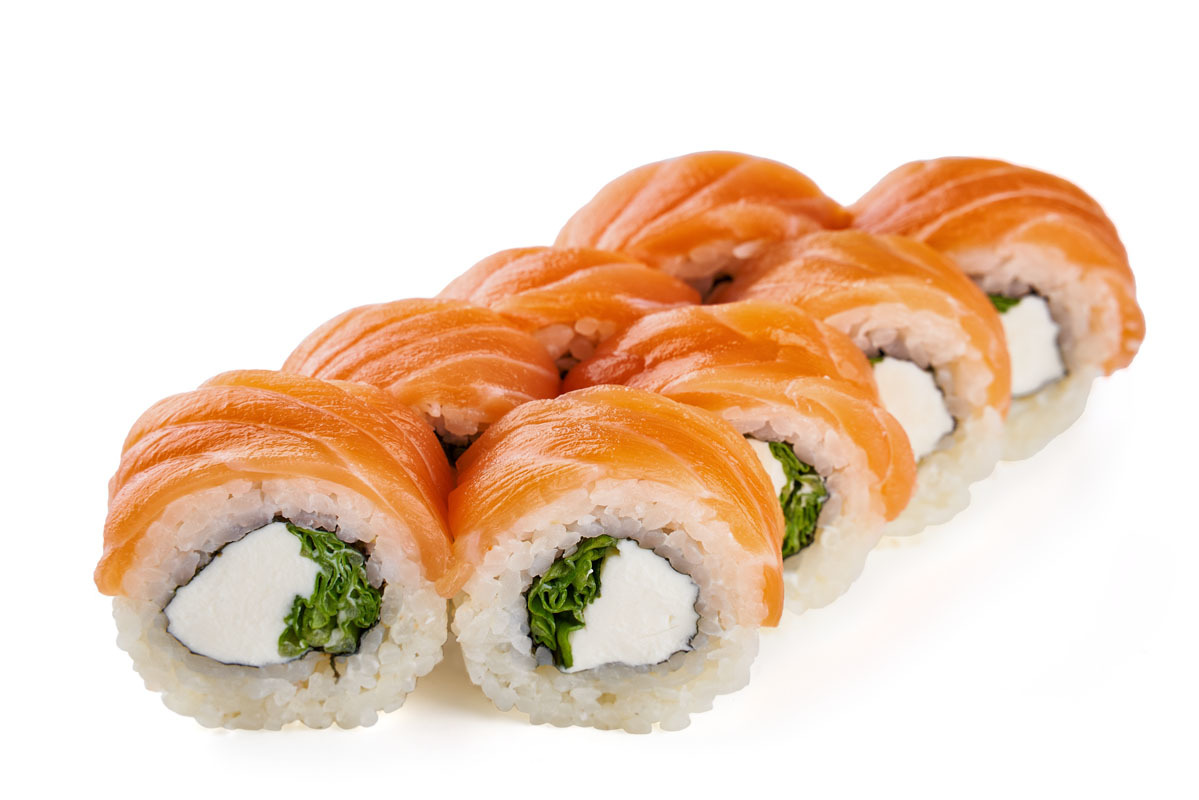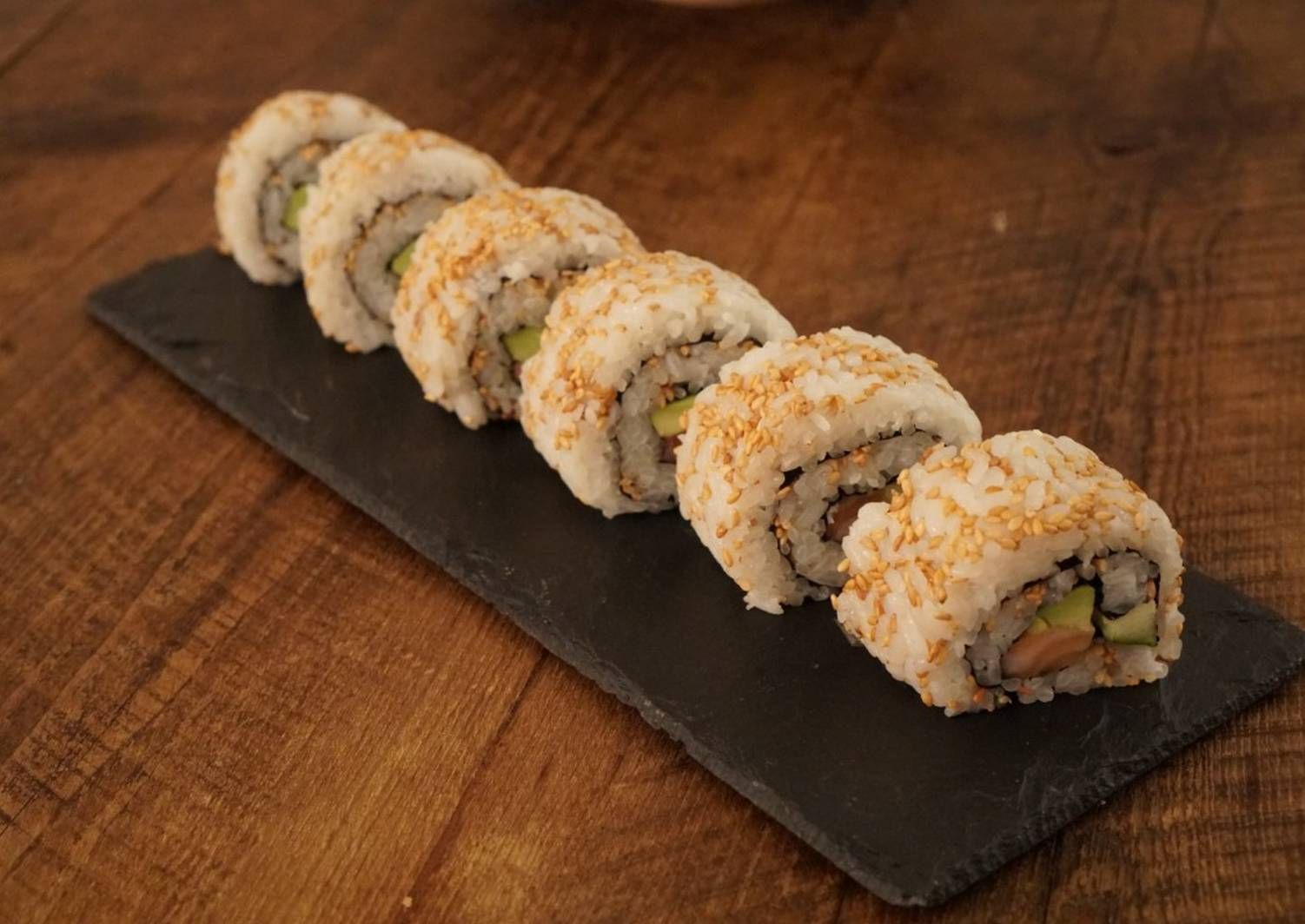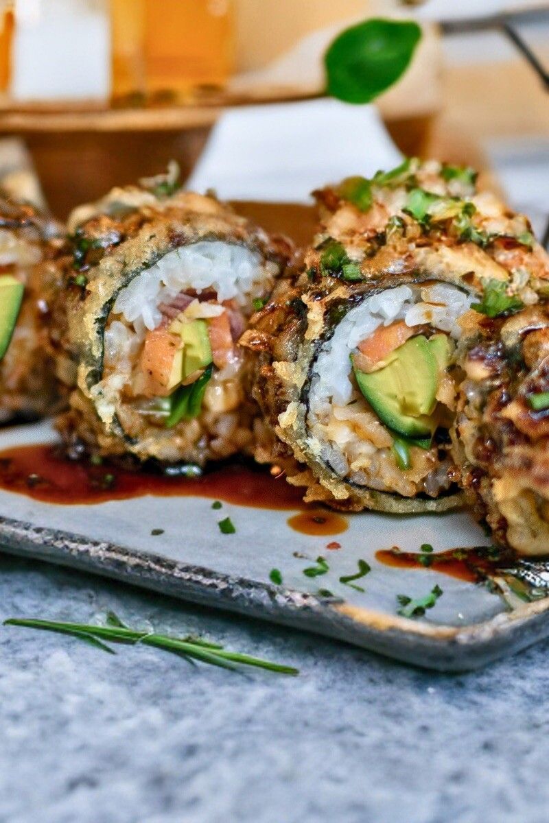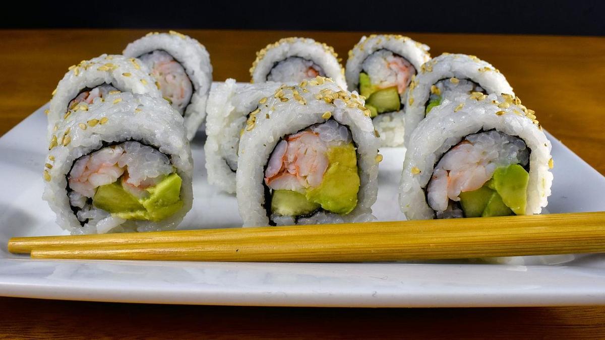 sushi düyüsü, xam balıq, avokado