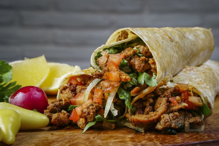 Lahmacun, toyuq əti, pomidor