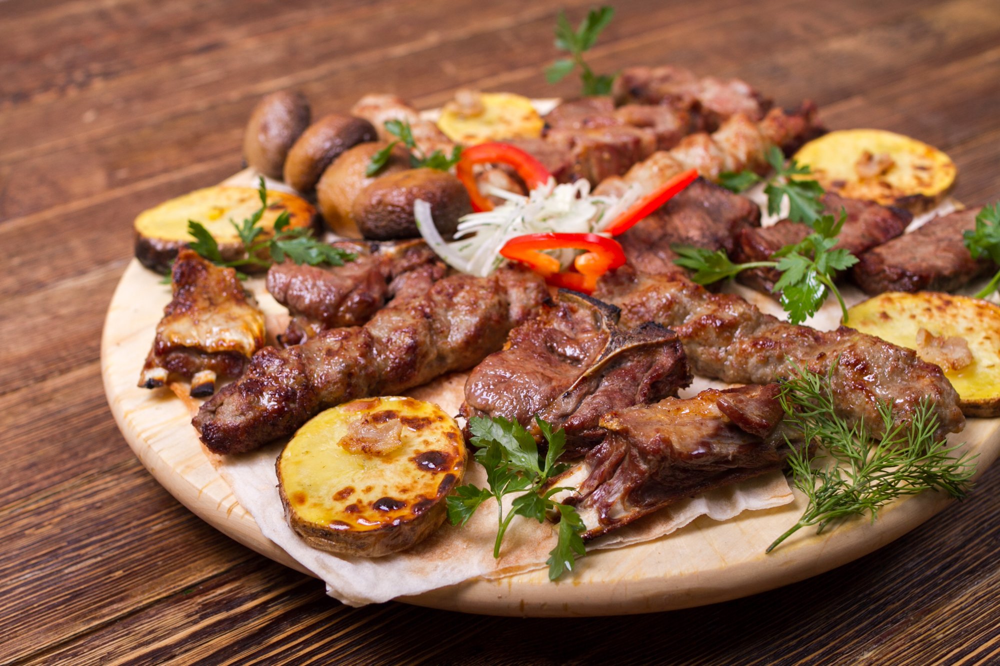 Mal əti, pomidor, cəfəri, qırmızı soğan, limon, acı bibər