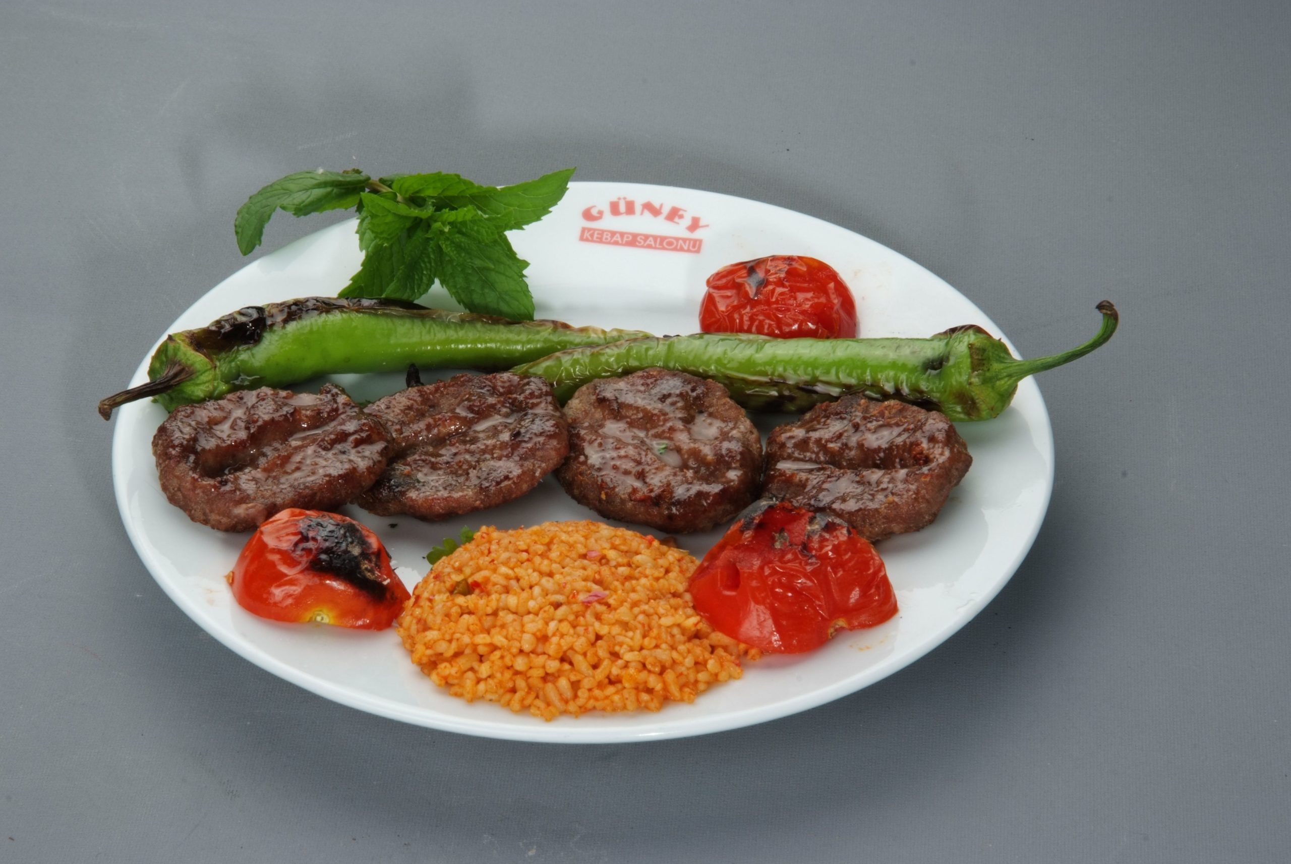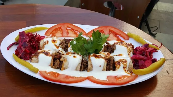 Mal əti, qızardılmış çörək, pomidor və bibər, kabab İskəndər sousu, kərə yağı, qatıq