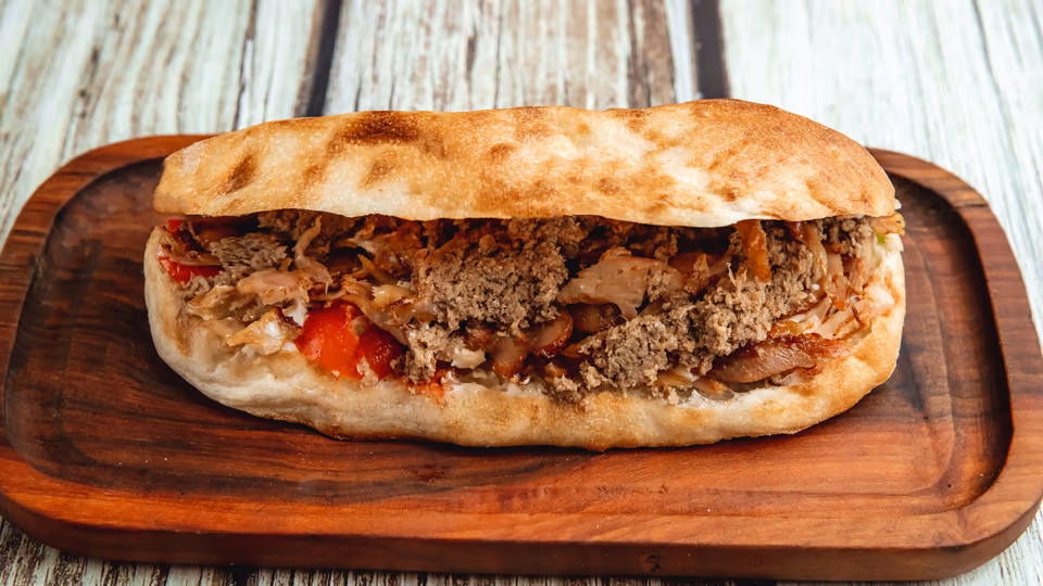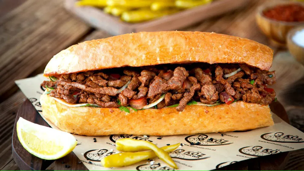 Mal əti, pomidor, kartof fri, turşu xiyar, qırmızı kələm, mozarrella pendiri