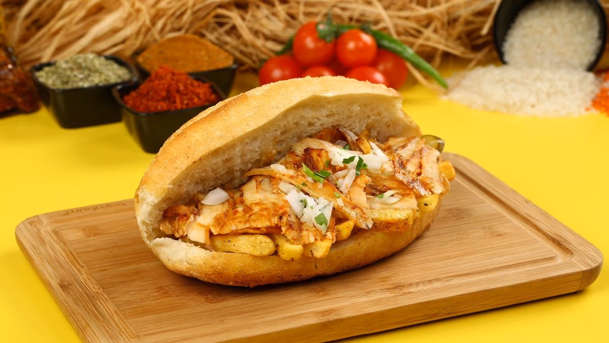 Toyuq əti, pomidor, kartof fri, turşu xiyar, qırmızı kələm, mozarrella pendiri