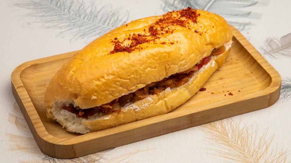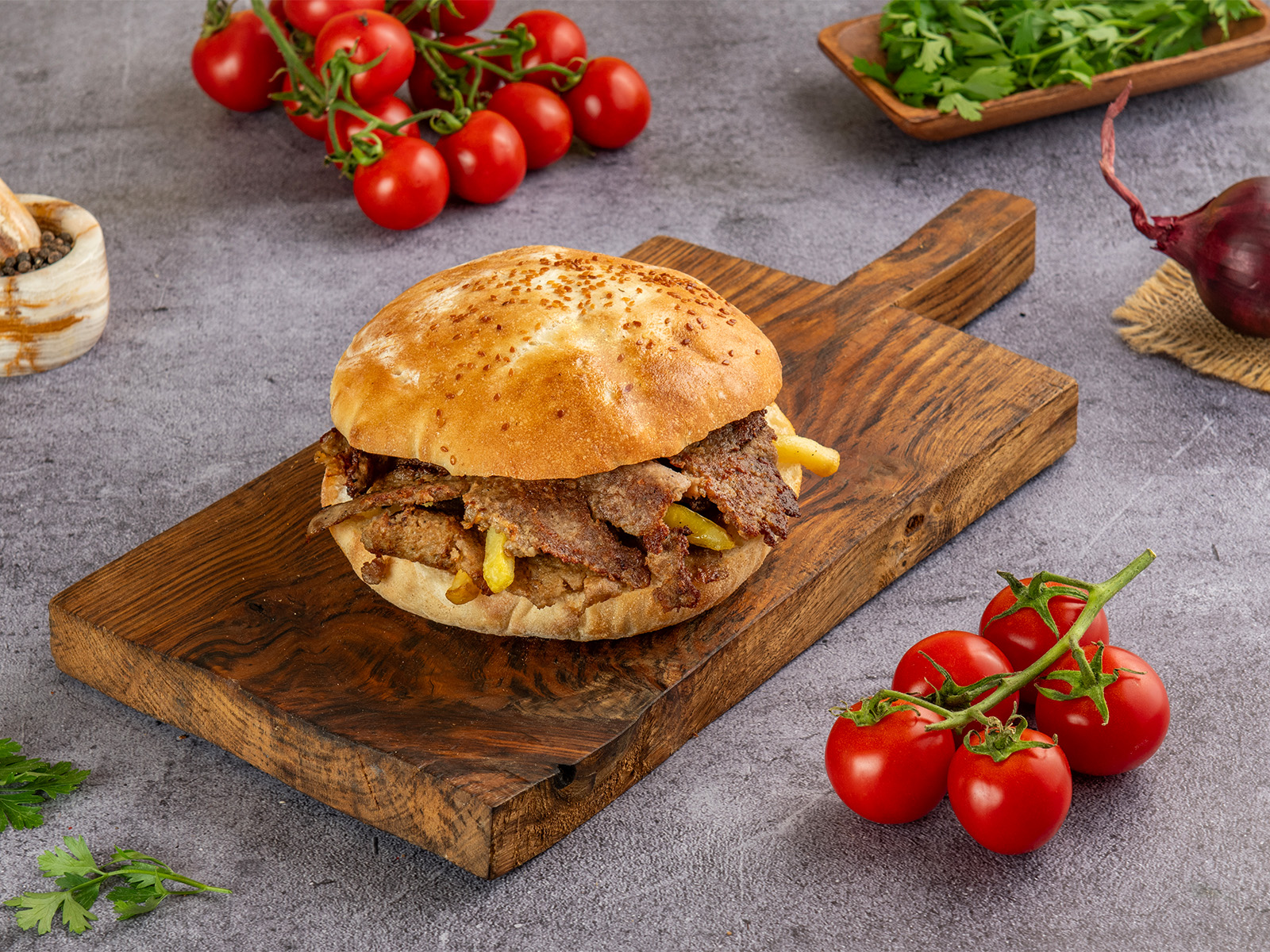 Mal əti, burger sousu, pomidor, turşu xiyar, kahı