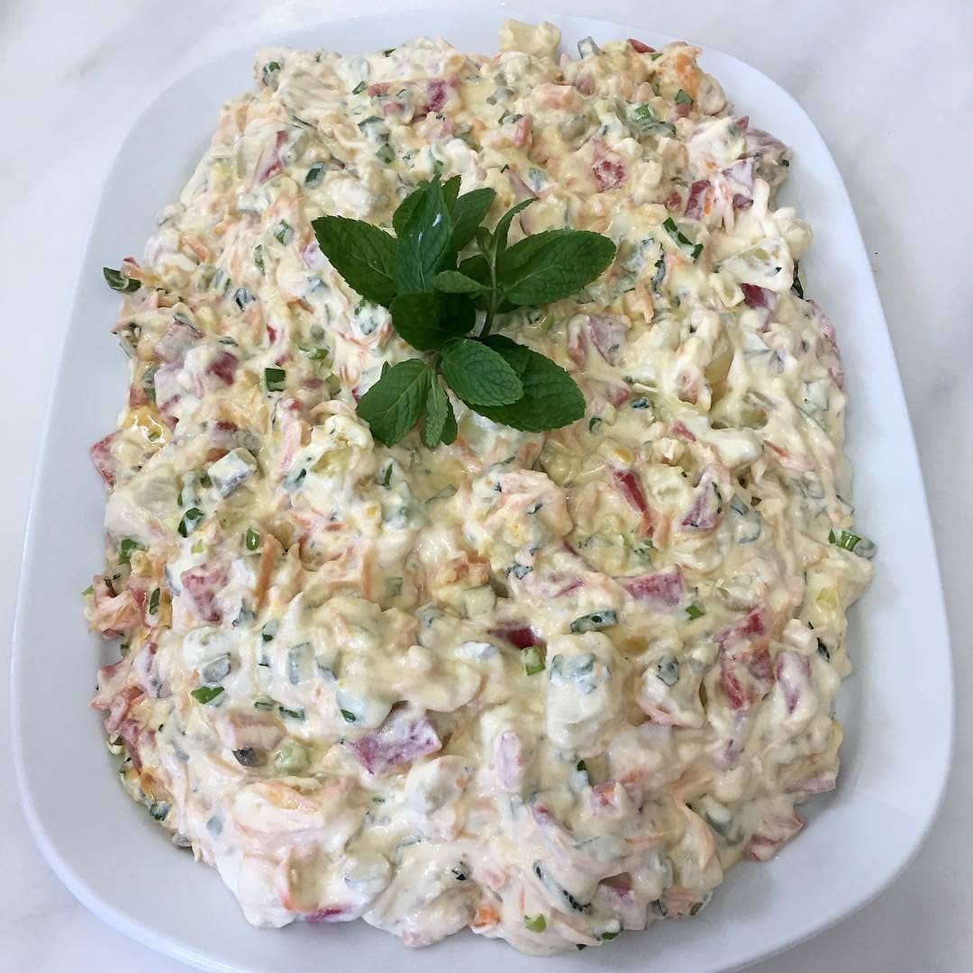 Mal əti, pomidor, xiyar, cəfəri, mayonez, kartof