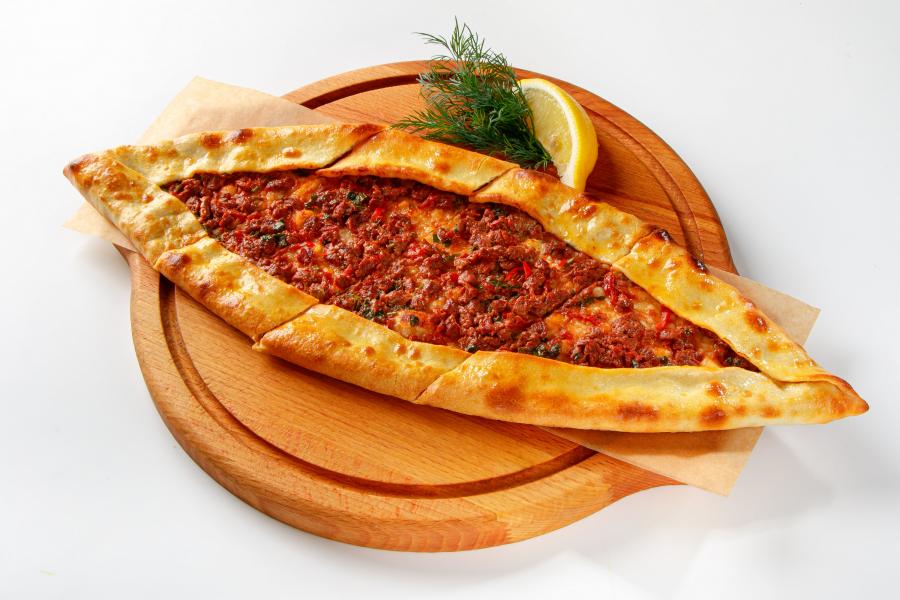 Pide xəmirı, ət, soğan, pomidor, bibər, cəfəri, mozzarella pendir