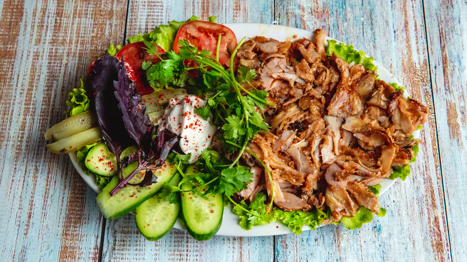 Toyuq əti, xiyar, pomidor, cəfəri, qatıq