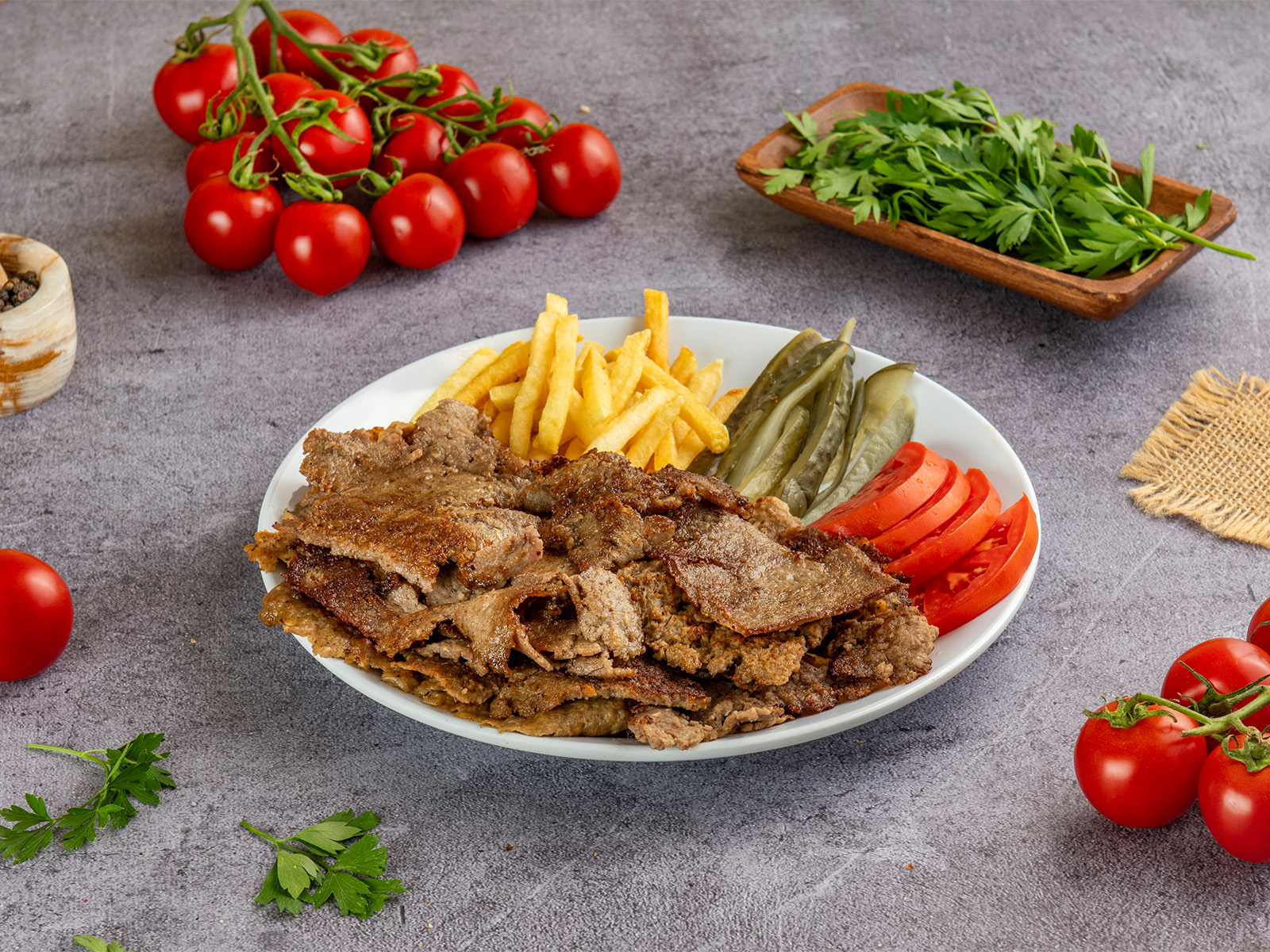 Mal əti, turşu xiyar, kartof, şaurma sousu